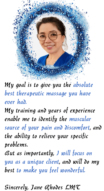 Many people have been helped by Jane’s professional and therapeutic massage treatments, and perhaps it is time you also called Jane to schedule a wonderful healing and refreshing massage treatment in the privacy of your home. You have nothing to lose …but your pain!